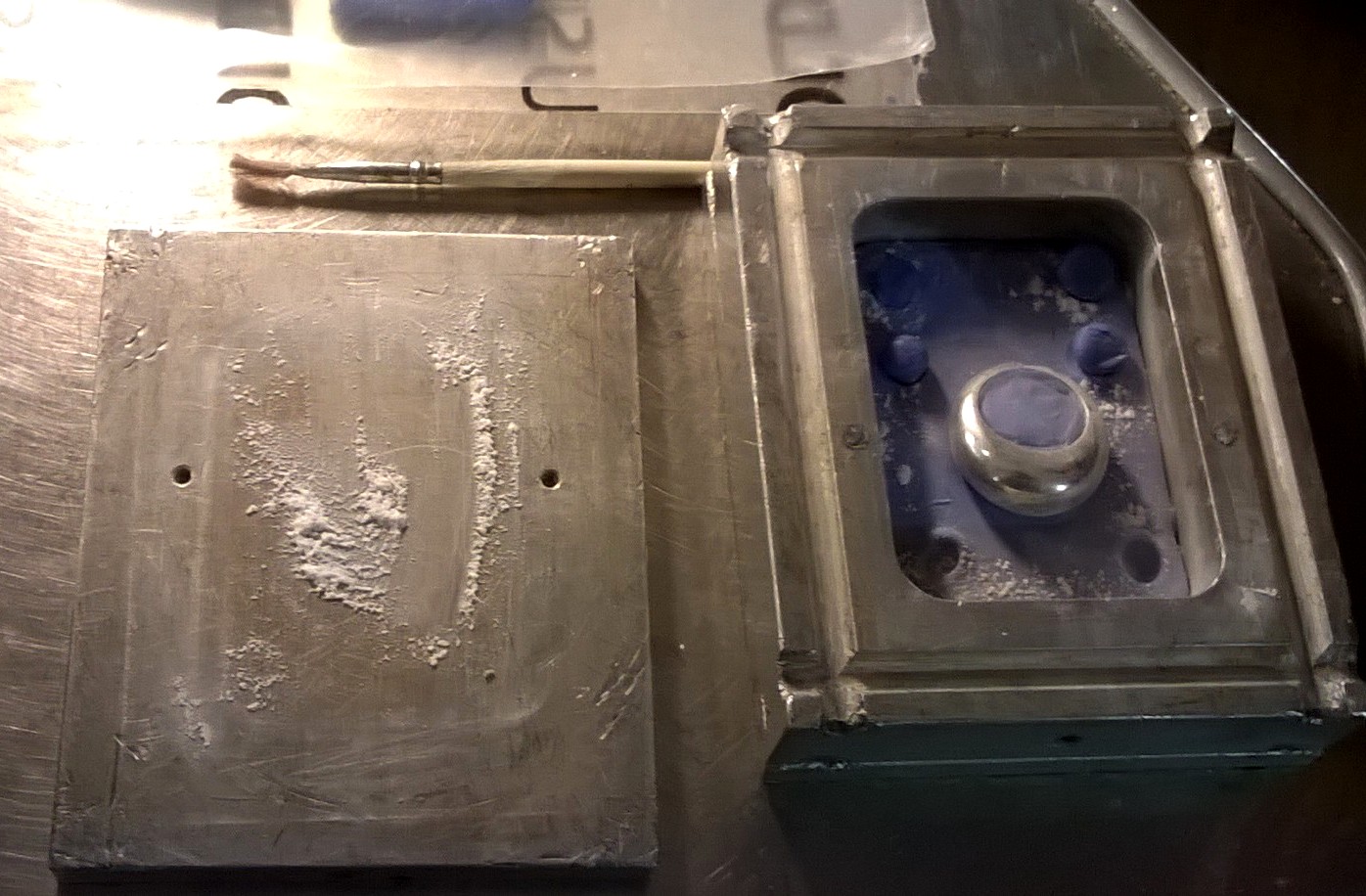 Anyway, I digress. I made a blue silicone mould of the finished bombato ring in a metal staffa (stirrup?!) and cooked it in the vulcanising press for about 50 minutes to set the silicone.