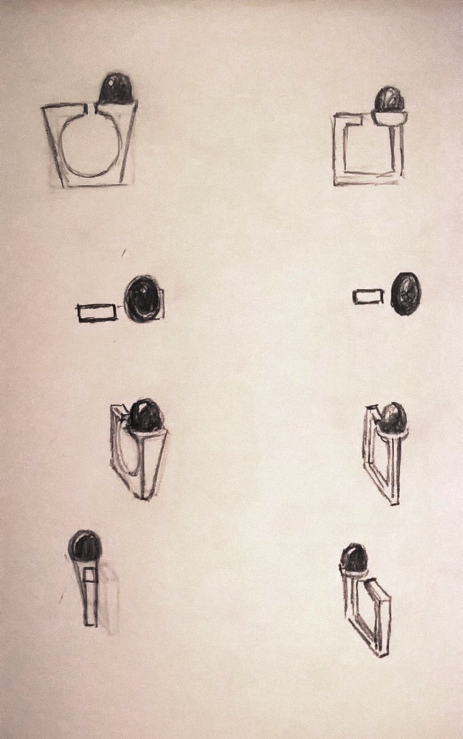 I was a bit dazzled by the sudden abundance of choice spread out before me, so Ignacio told me to select just a couple of stones and put the rest away, in order to focus my mind on what I could do with those particular stones. The design would change depending on the individual qualities of the stones chosen, because their shape, colour or opacity might call for different setting methods. I had already done some drawings for stones I had acquired before the Irish parcel arrived, and Ignacio talked to me about problems I might have with such designs so I did a few more sketches based on his advice. I decided to go ahead with a design for one of my old gemstones, and do a new drawing for one of Clare’s. I dipped both stones in hot red wax to make the nest which will ultimately be cast in silver and incorporated into the designs.